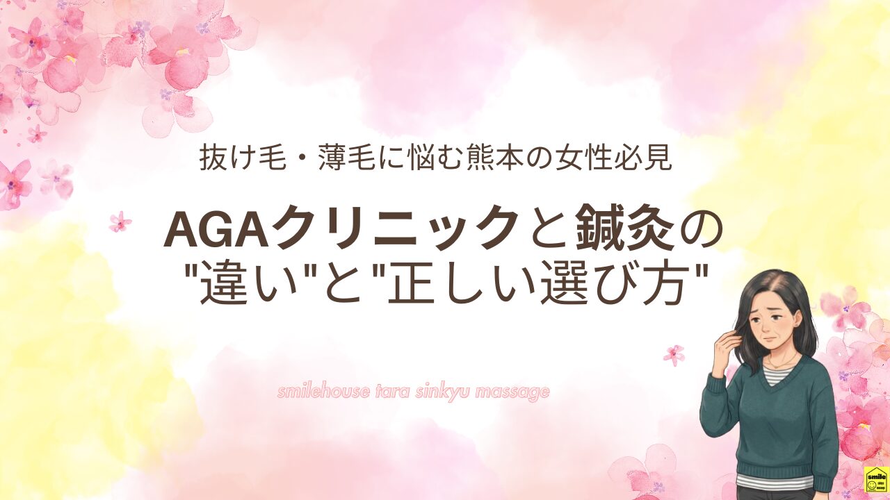 そこで今回は、熊本で薄毛・抜け毛に悩む女性に向けて、AGAクリニックと鍼灸の違いと選び方を女性鍼灸師が分かりやすく解説します。。
