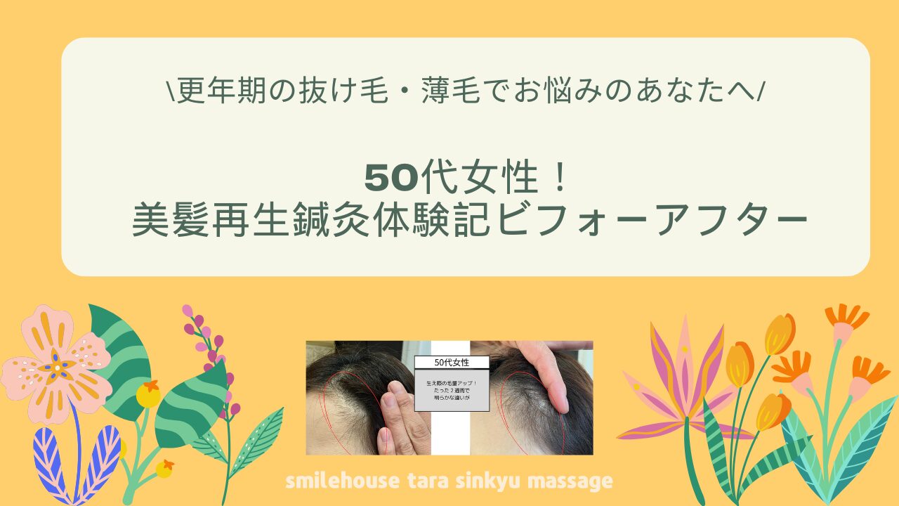 更年期のホルモン変化で、抜け毛が増え、その結果、頭皮が目立つほどの薄毛になる方も少なくありません…。熊本市にある、smilehouseたら鍼灸マッサージ院でも、40代〜50代の女性の更年期のお客様から、このようなお悩みをよくお聞きします。