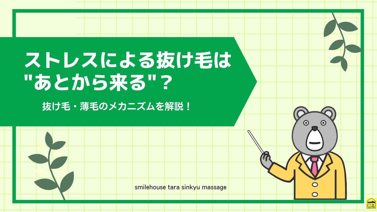 この記事では、熊本にあるsmilehouseたら鍼灸マッサージ院でも相談が増えている、ストレス性の抜け毛・薄毛について、医学的な仕組みとともに女性鍼灸師の筆者が、分かりやすく解説していきます。